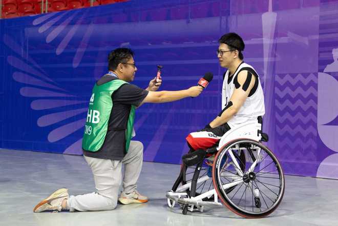 这是全国残特奥会男子三人篮球铜牌赛比赛现场,最终浙江队获得本场比赛胜利。