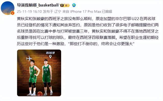 很多关心辽宁男篮的球迷,都知道,此前辽宁男篮官宣双子星黄秋实和张峻豪去西甲U22联赛打球了,加盟毕尔巴鄂队。然而,就最新的消息来看,两人并未进入人家的地盘。说好的去西甲,为何变了卦?著名媒体人导演我躺哪给出了辽篮双子星遭弃的原因,结果真是叫人心疼不已。