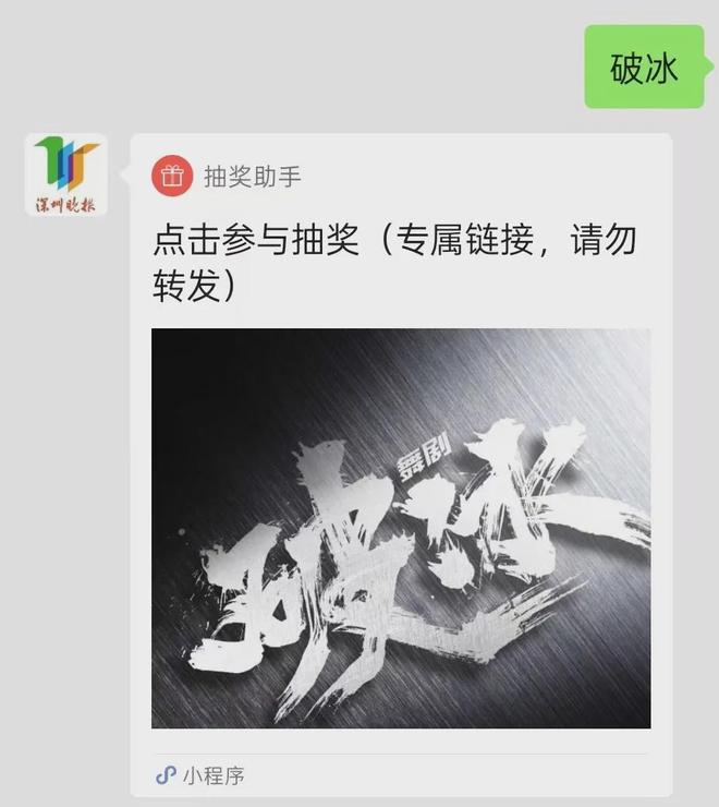 3、在对话框中输入关键词“破冰”,获取链接参与抽奖