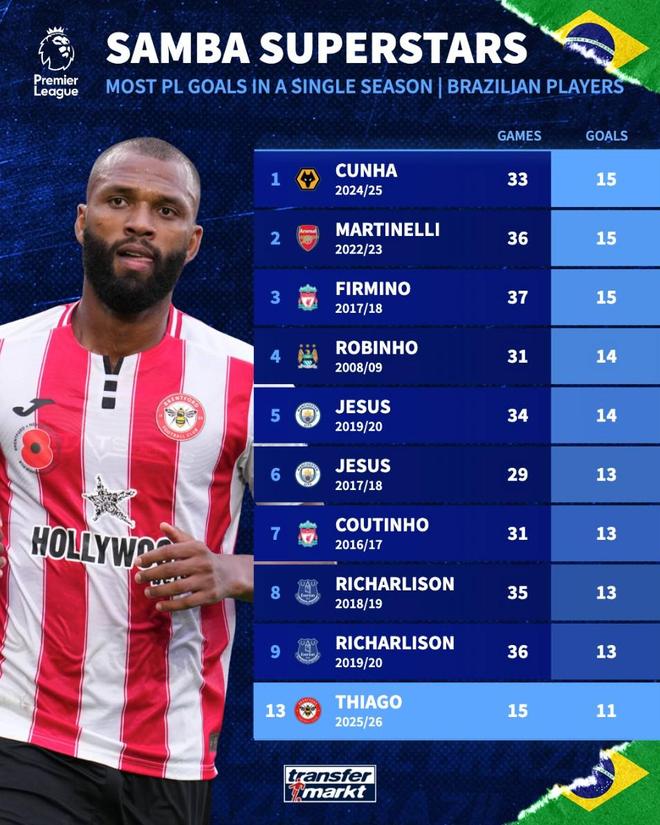 13. 伊戈尔-蒂亚戈(2025-26布伦特福德) 15场 11球
